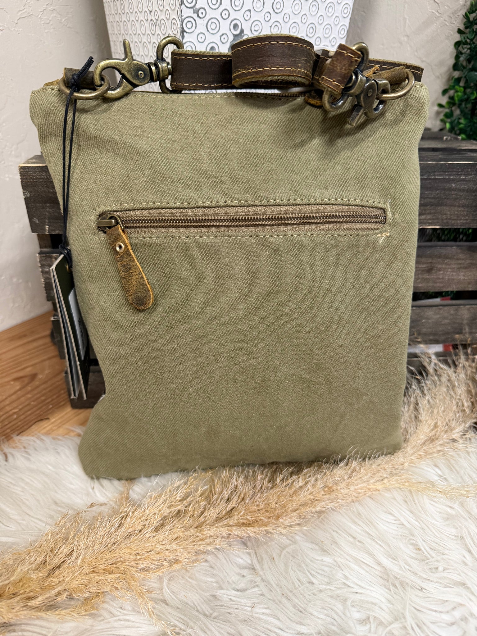 Inspired by the artisanal tribal patterns of the country, this upcycled canvas bag will be a striking addition to your wardrobe. Crafted with soothing brown tones, the bag features a distressed leather accent to add some antiquated appeal to the bag. The front pocket is complemented by a beautiful western tassel-decorated zipper to ensure the utmost safety of your essentials.
